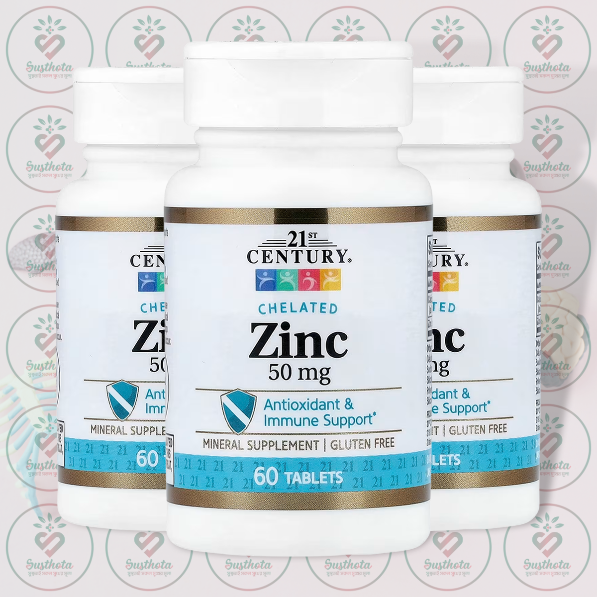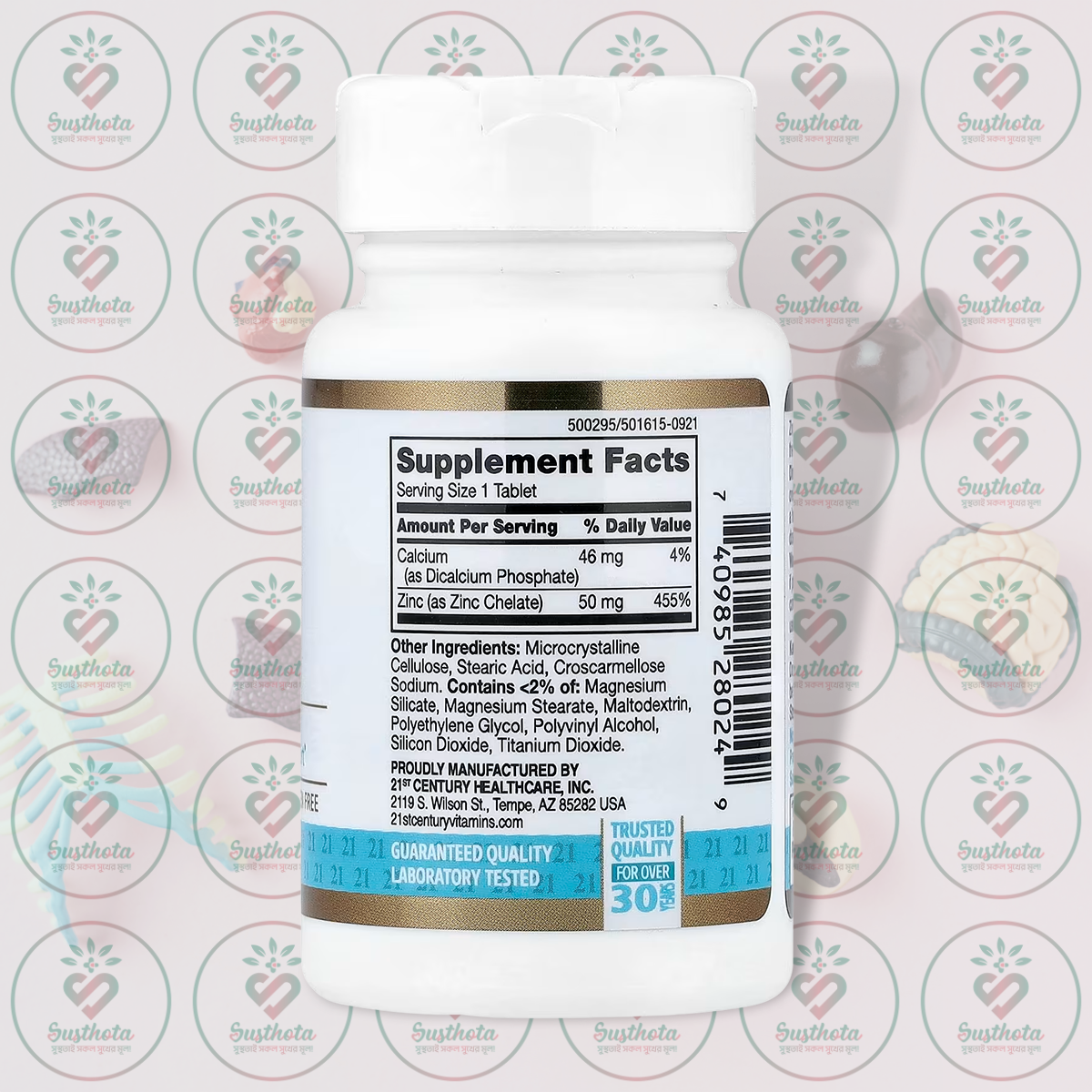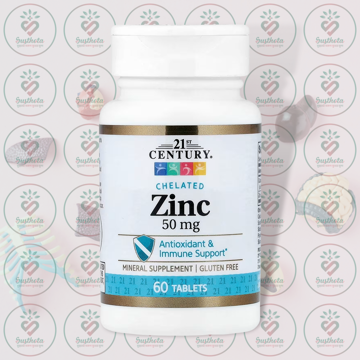 21st Century Chelated Zinc - 50 mg - 60 Tablets is now available in Bangladesh at Susthota. This premium mineral supplement is formulated with superior chelation technology for enhanced absorption and maximum bioavailability. It provides powerful antioxidant and immune support with 50 mg of highly bioavailable zinc per tablet. With 60 tablets providing a two-month supply, it offers exceptional value for comprehensive mineral supplementation. 21st Century Chelated Zinc is now available at the lowest price in our shop, ensuring accessibility for health-conscious individuals. Order authentic Chelated Zinc from our shop today at the cheapest price in BD. Call our helpline to know the latest price and availability of the original 21st Century Chelated Zinc in Bangladesh. Experience superior mineral absorption and immune support, now available in BD.