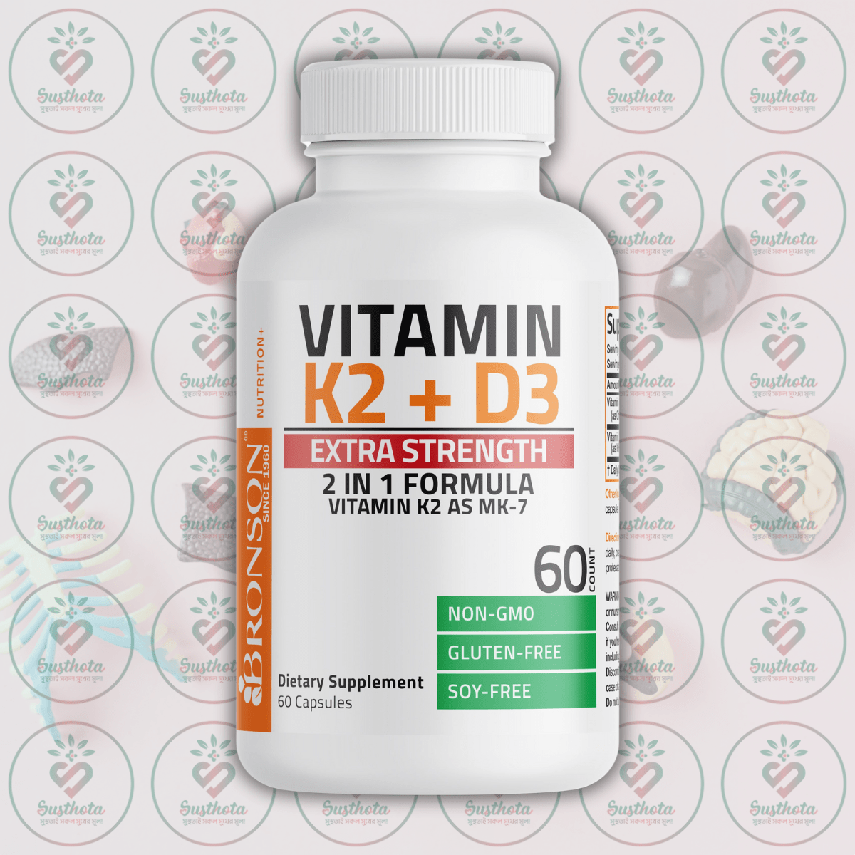 Bronson Vitamin K2 + D3 Extra Strength - 10,000 IU D3 & 120 mcg K2 - 60 Capsules is now available in Bangladesh at Susthota. This high-potency supplement supports bone health, cardiovascular wellness, and immune function. It delivers a synergistic blend of Vitamin D3 and K2 for optimal calcium absorption and distribution. Bronson Vitamin K2 + D3 is now available at the lowest price in our shop, ensuring affordability and quality. Order authentic Bronson Vitamin K2 + D3 from our shop today at the cheapest price in BD. Call our helpline to know the latest price and availability of Bronson Vitamin K2 + D3 in Bangladesh.