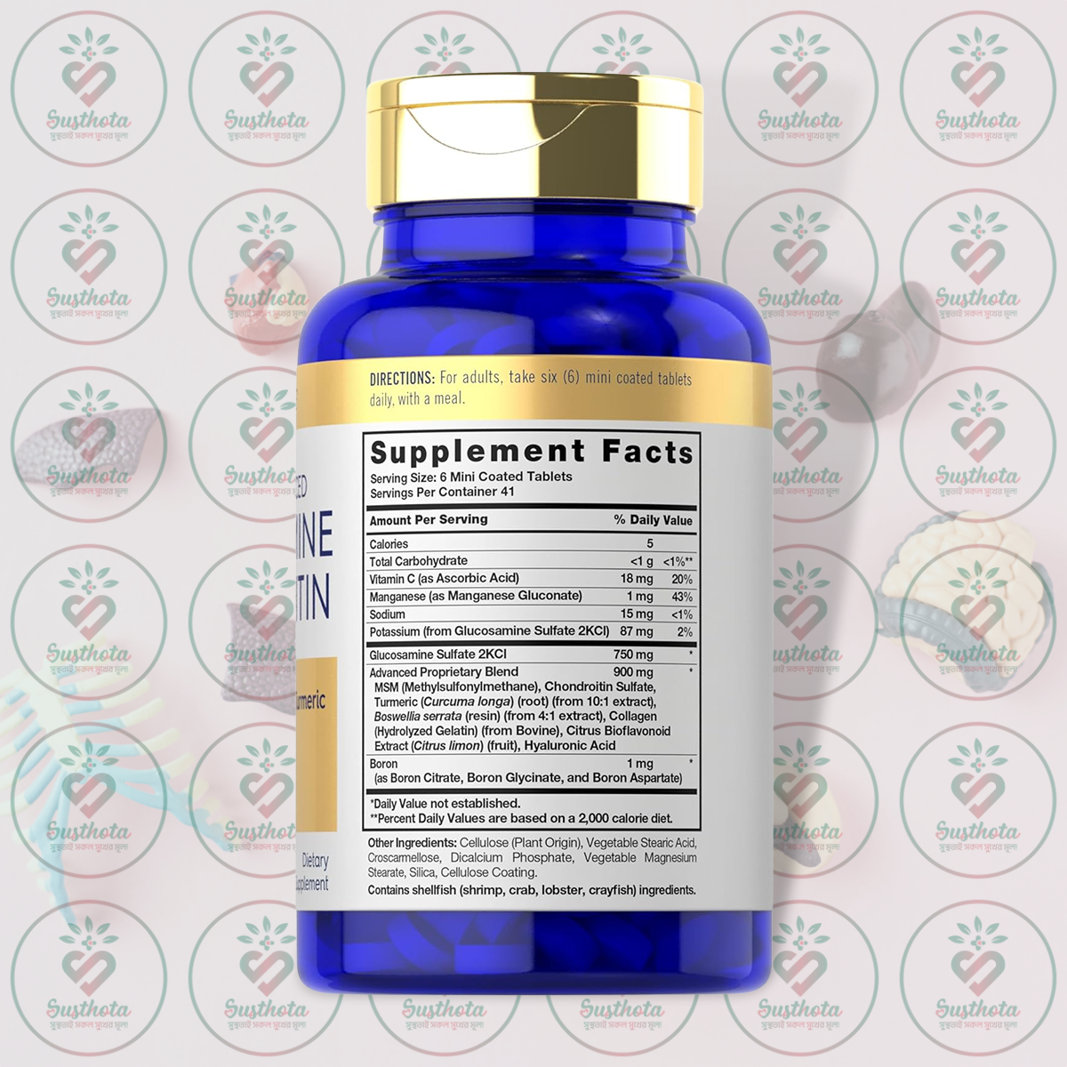 | Ingredients | Glucosamine Sulfate 2KCI (750 mg), Advanced Proprietary Blend (900 mg): MSM (Methylsulfonylmethane), Chondroitin Sulfate, Turmeric (Curcuma longa) (root) (from 10:1 extract), Boswellia serrata (resin) (from 4:1 extract), Collagen (Hydrolyzed Gelatin) (from Bovine), Citrus Bioflavonoid Extract (Citrus limon) (fruit), Hyaluronic Acid, Vitamin C (as Ascorbic Acid) 18 mg, Manganese (as Manganese Gluconate) 1 mg, Boron 1 mg (as Boron Citrate, Boron Glycinate, and Boron Aspartate), Sodium 15 mg, Potassium 87 mg |