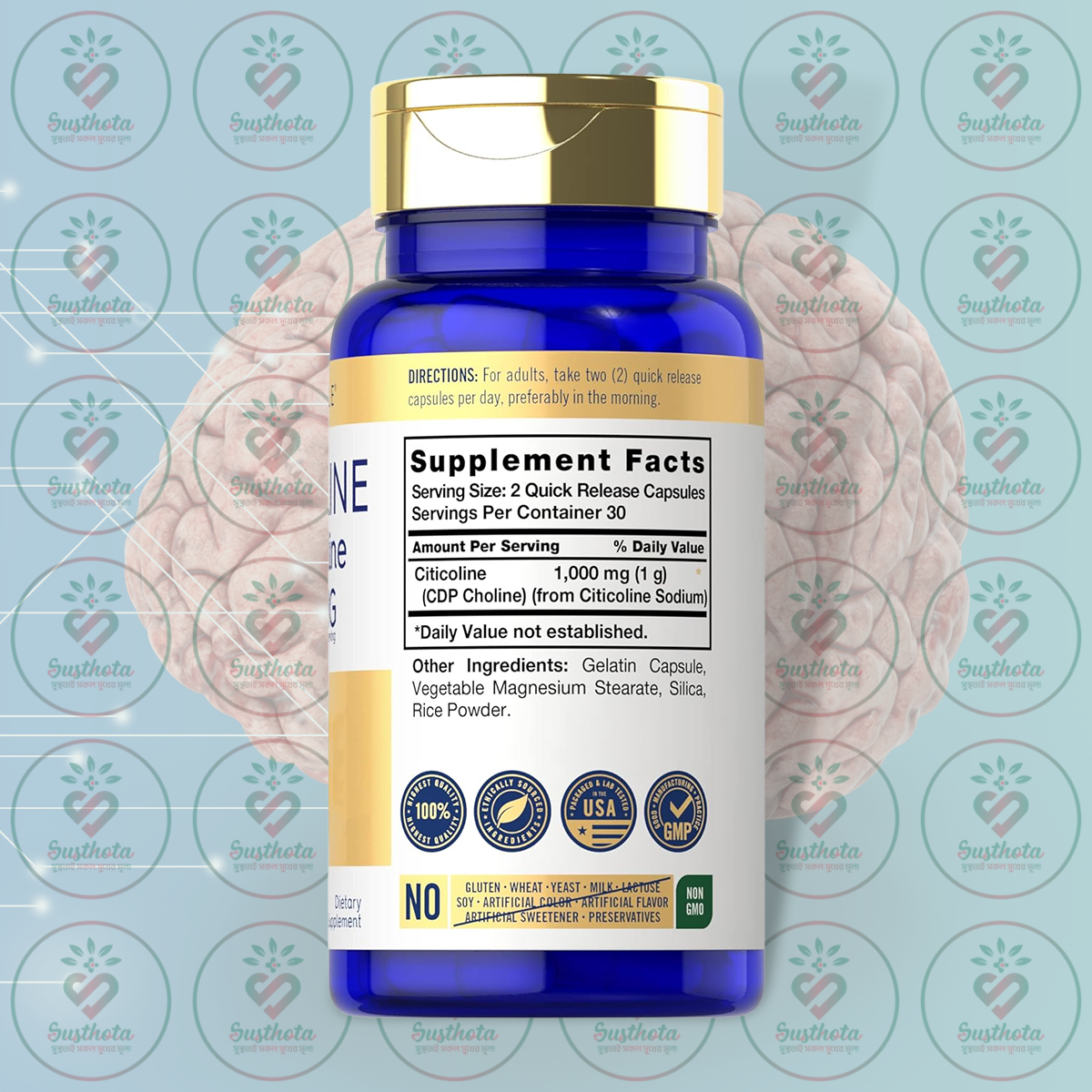 | Ingredients | Citicoline 1,000 mg (1 g) (CDP Choline) (from Citicoline Sodium), Gelatin Capsule, Vegetable Magnesium Stearate, Silica, Rice Powder |