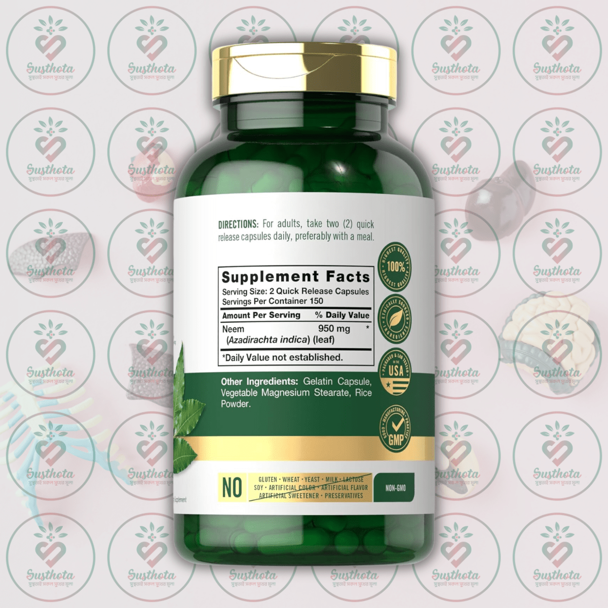 Ingredients | Neem Leaf (Azadirachta indica) Powder, Rice Powder, Gelatin Capsule, Vegetable Magnesium Stearate, Silica |