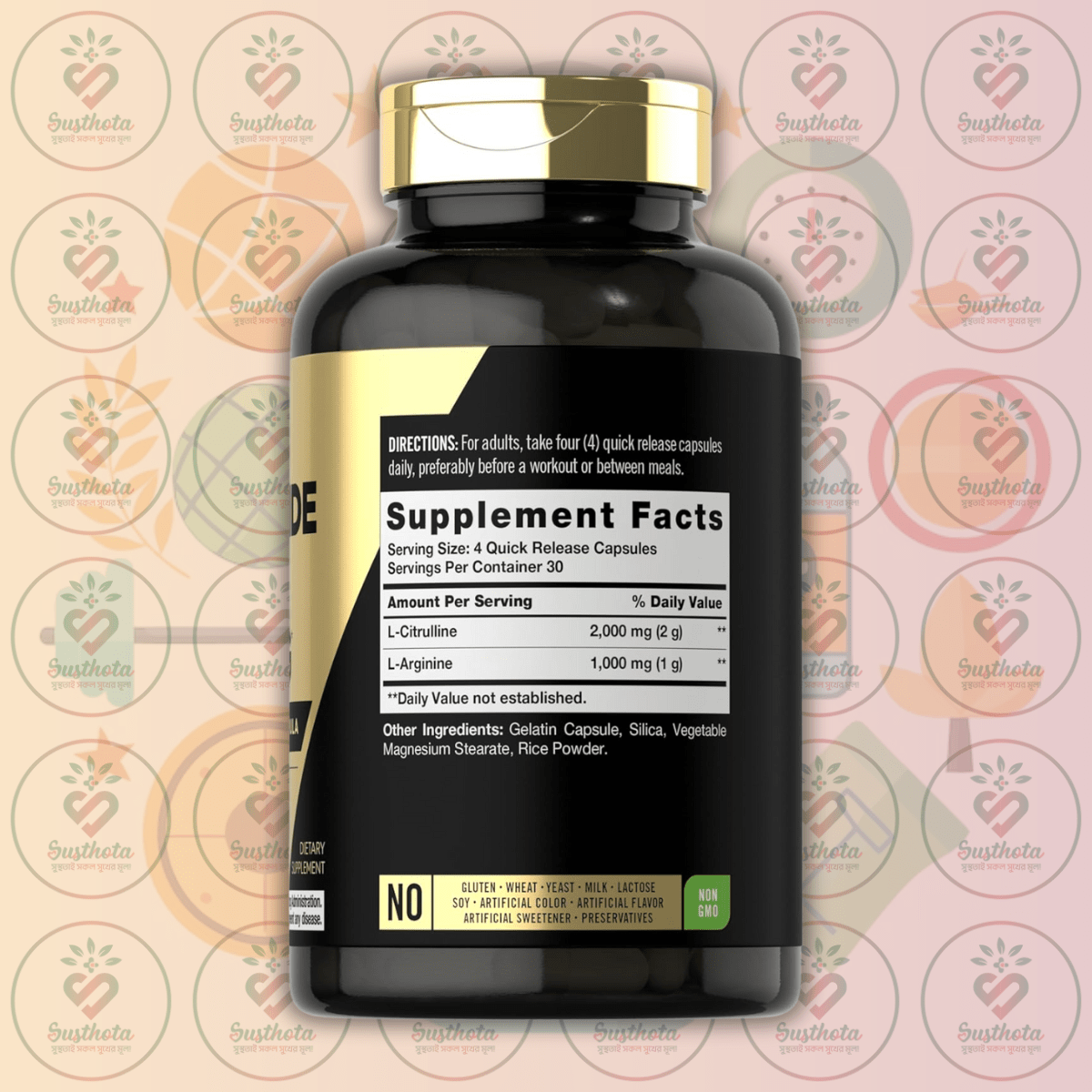 The supplement features a potent dose of 2000mg L-Citrulline and 1000mg L-Arginine per serving. These amino acids are known for their ability to enhance blood flow, oxygen delivery, and overall endurance. The capsules are non-GMO, gluten-free, and free from artificial colors, flavors, sweeteners, and preservatives, ensuring a clean and effective product. Each capsule is carefully formulated to meet high-quality standards, making it a reliable choice for anyone looking to improve their fitness journey.