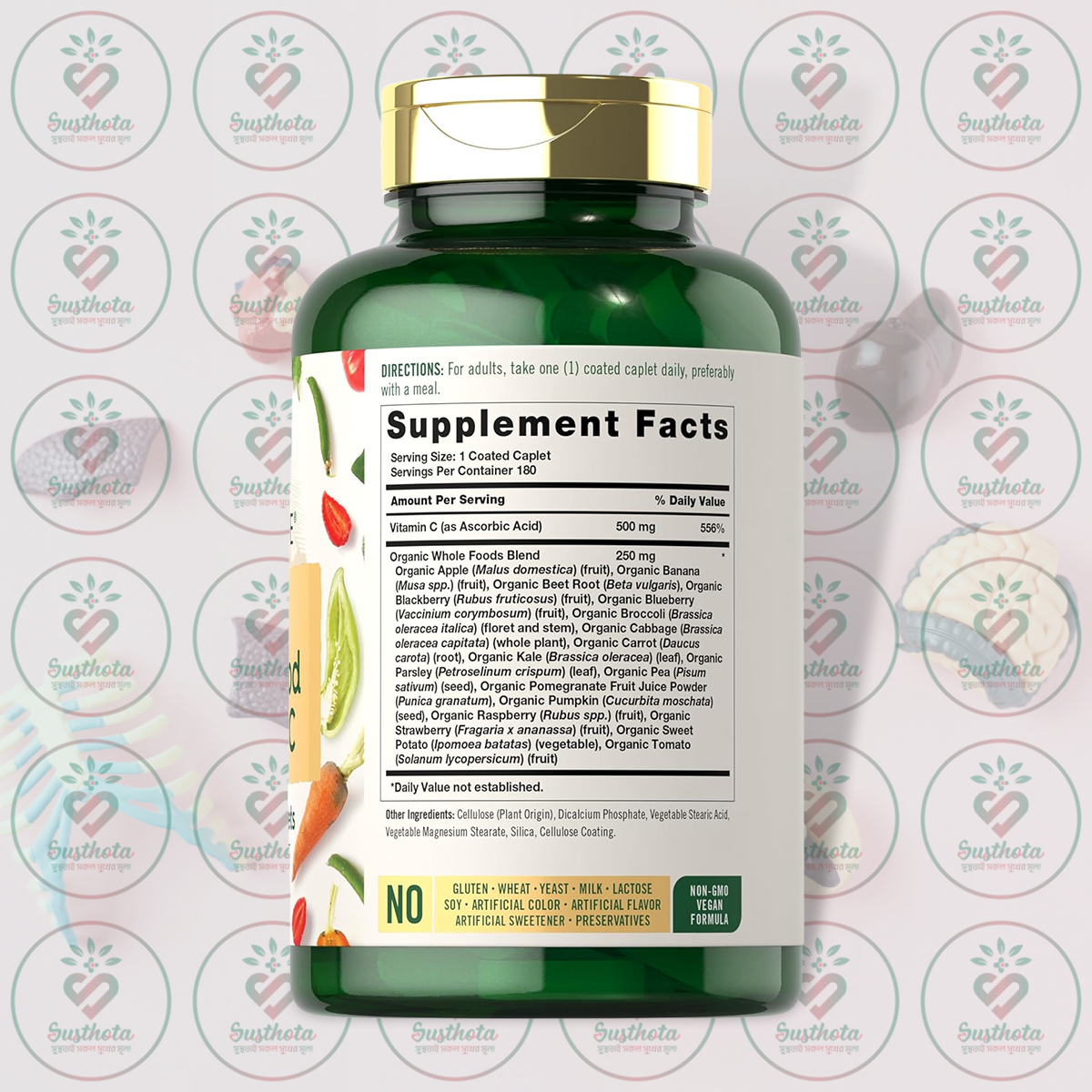 | Ingredients | Vitamin C (as Ascorbic Acid) 500 mg, Organic Whole Foods Blend 250 mg (Organic Apple, Organic Banana, Organic Beet Root, Organic Blackberry, Organic Blueberry, Organic Broccoli, Organic Cabbage, Organic Carrot, Organic Kale, Organic Parsley, Organic Pea, Organic Pomegranate Fruit Juice Powder, Organic Pumpkin, Organic Raspberry, Organic Strawberry, Organic Sweet Potato, Organic Tomato), Cellulose (Plant Origin), Dicalcium Phosphate, Vegetable Stearic Acid, Vegetable Magnesium Stearate, Silica, Cellulose Coating. |
