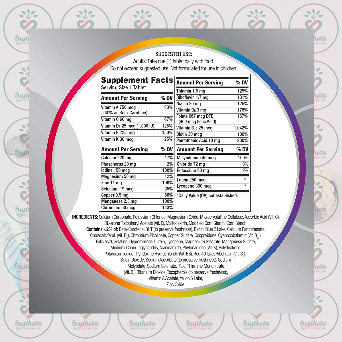 | Ingredients | Vitamin A 750 mcg (40% as Beta-Carotene), Vitamin C 60 mg, Vitamin D3 25 mcg (1,000 IU), Vitamin E 22.5 mg, Vitamin K 30 mcg, Thiamin 1.5 mg, Riboflavin 1.7 mg, Niacin 20 mg, Vitamin B6 3 mg, Folate 667 mcg DFE (400 mcg Folic Acid), Vitamin B12 25 mcg, Biotin 30 mcg, Pantothenic Acid 10 mg, Calcium 220 mg, Phosphorus 20 mg, Iodine 150 mcg, Magnesium 50 mg, Zinc 11 mg, Selenium 19 mcg, Copper 0.5 mg, Manganese 2.3 mg, Chromium 50 mcg, Molybdenum 45 mcg, Chloride 72 mg, Potassium 80 mg, Lutein 250 mcg, Lycopene 300 mcg. Other Ingredients: Calcium Carbonate, Potassium Chloride, Magnesium Oxide, Microcrystalline Cellulose, Ascorbic Acid (Vit. C), DL-alpha Tocopheryl Acetate (Vit. E), Maltodextrin, Modified Corn Starch, Corn Starch, Beta-Carotene, BHT (to preserve freshness), Biotin, Blue 2 Lake, Calcium Pantothenate, Cholecalciferol (Vit. D3), Chromium Picolinate, Copper Sulfate, Cospovidone, Cyanocobalamin (Vit. B12), Folic Acid, Gelating, Hypromellose, Lutein, Lycopene, Magnesium Stearate, Manganese Sulfate, Medium-Chain Triglycerides, Niacinamide, Phytonadione (Vit. K), Polydextrose, Potassium iodide, Pyridoxine Hydrochloride (Vit. B6), Red 40 lake, Riboflavin (Vit. B2), Silicin Dioxide, Sodium Ascorbate (to preserve freshness), Sodium Molybdate, Sodium Selenate, Talc, Thiamine Mononitrate (Vit. B1), Titanium Dioxide, Tocopherols (to preserve freshness), Vitamin A Acetate, Yellow 6 Lake, Zinc Oxide. |