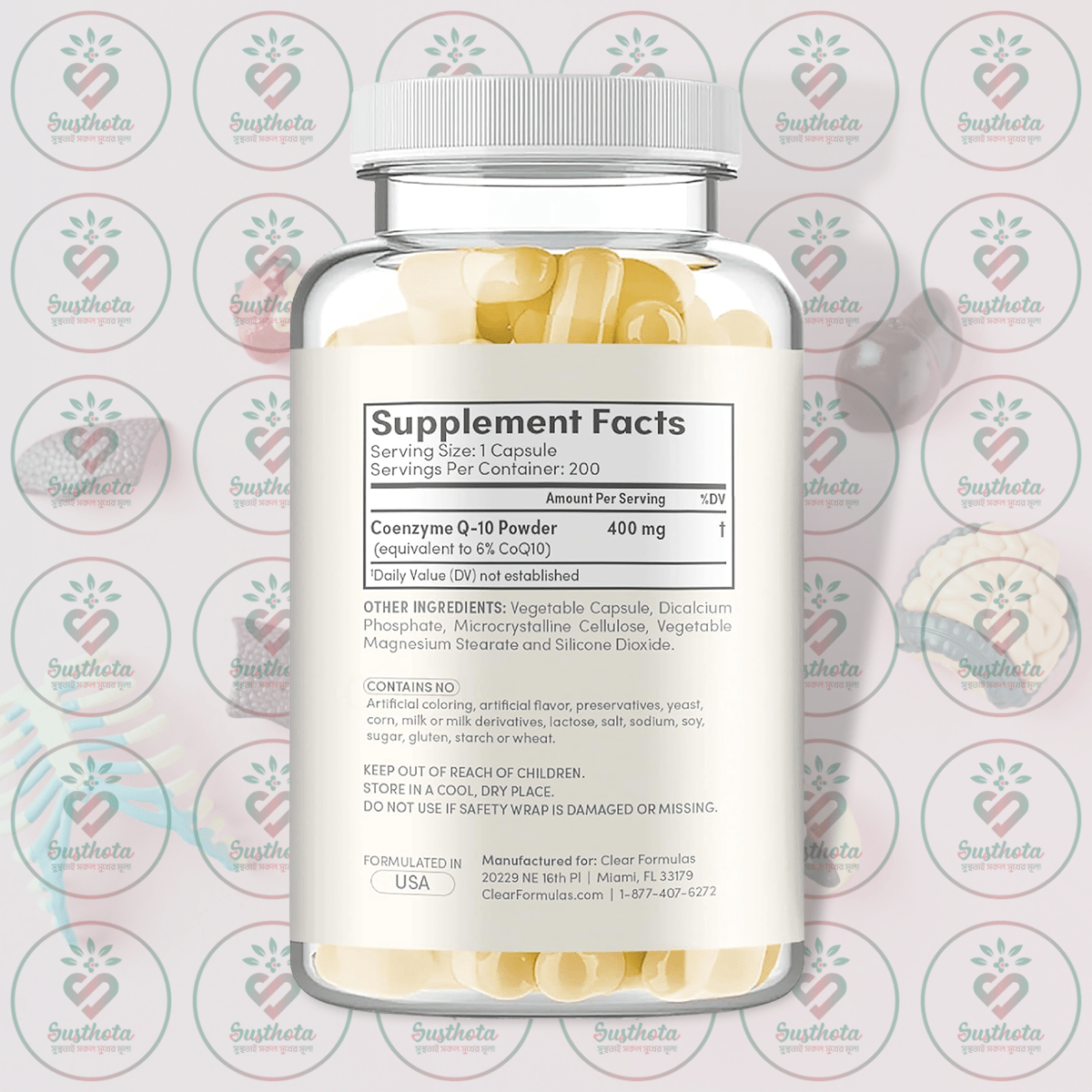 ClearFormulas CoQ-10 - 400 mg - 200 Capsules is now available in Bangladesh at Susthota. This high-potency cardiovascular supplement is formulated to support heart health, boost energy production, and provide powerful antioxidant protection. It contains 400 mg of pure Coenzyme Q10 per capsule for maximum effectiveness. With 200 capsules providing 200 servings, it offers exceptional value and convenience for daily supplementation. ClearFormulas CoQ-10 is now available at the lowest price in our shop, ensuring accessibility for health-conscious individuals. Buy authentic ClearFormulas CoQ-10 from Susthota today at the cheapest price in BD. Call our helpline to know the latest price and availability of the original ClearFormulas CoQ-10 in Bangladesh. Experience the powerful benefits of this essential nutrient for heart health and energy, now available in BD.