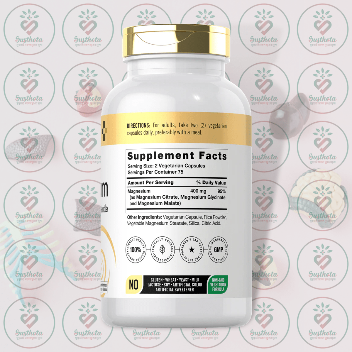 | Ingredients | Magnesium 400 mg (as Magnesium Citrate, Magnesium Glycinate and Magnesium Malate), Vegetarian Capsule, Rice Powder, Vegetable Magnesium Stearate, Silica, Citric Acid |
