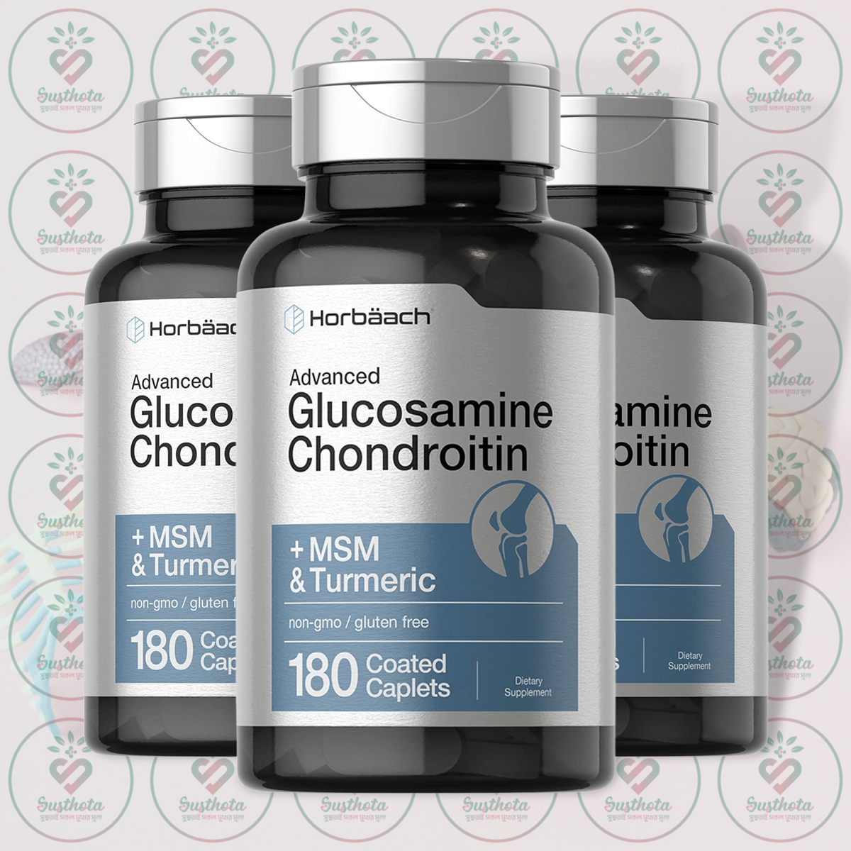 Horbäach Advanced Glucosamine Chondroitin + MSM & Turmeric - 180 Coated Caplets is now available in Bangladesh at Susthota. This comprehensive joint support supplement is formulated with 1500 mg glucosamine sulfate and a powerful proprietary blend for optimal joint health. It contains premium ingredients including MSM, chondroitin, turmeric, and Boswellia serrata for enhanced mobility and comfort. With 180 coated caplets providing 30 servings, it offers exceptional value for long-term joint care. Horbäach Advanced Glucosamine Chondroitin is now available at the lowest price in our shop, ensuring accessibility for those seeking natural joint support. Order authentic Horbäach joint supplement from our shop today at the cheapest price in BD. Call our helpline to know the latest price and availability of the original Horbäach Advanced Glucosamine Chondroitin in Bangladesh. Experience superior joint support with this advanced formula, now available in BD.