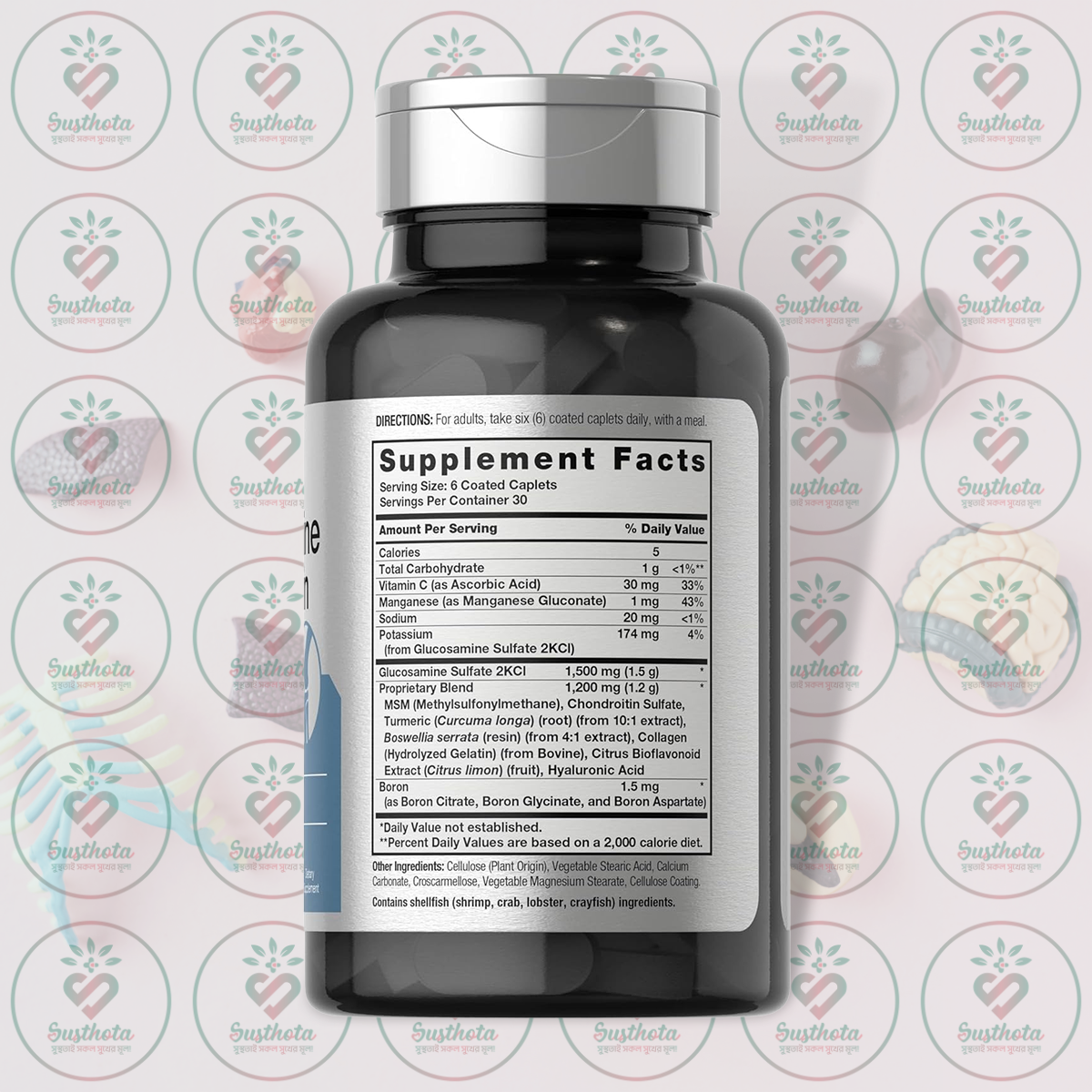 | Ingredients | Glucosamine Sulfate 2KCl (1,500 mg), Proprietary Blend (1,200 mg): MSM (Methylsulfonylmethane), Chondroitin Sulfate, Turmeric (Curcuma longa) (root) (from 10:1 extract), Boswellia serrata (resin) (from 4:1 extract), Collagen (Hydrolyzed Gelatin) (from Bovine), Citrus Bioflavonoid Extract (Citrus limon) (fruit), Hyaluronic Acid, Boron (1.5 mg), Vitamin C (30 mg), Manganese (1 mg). Other Ingredients: Cellulose (Plant Origin), Vegetable Stearic Acid, Calcium Carbonate, Croscarmellose, Vegetable Magnesium Stearate, Cellulose Coating. |
