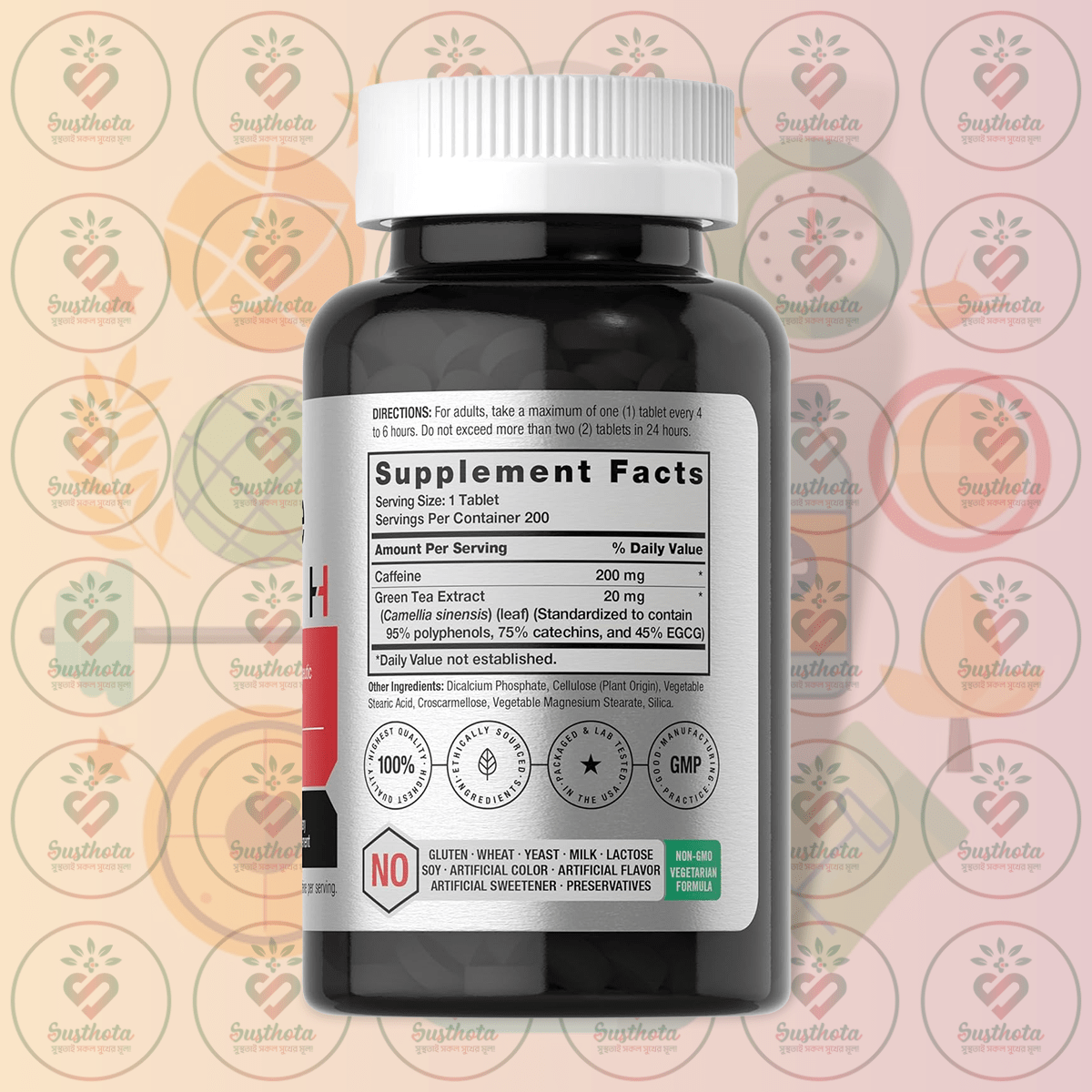 | Ingredients | Caffeine (200 mg), Green Tea Extract (Camellia sinensis) (leaf) (20 mg) (Standardized to contain 95% polyphenols, 75% catechins, and 45% EGCG), Dicalcium Phosphate, Cellulose (Plant Origin), Vegetable Stearic Acid, Croscarmellose, Vegetable Magnesium Stearate, Silica |