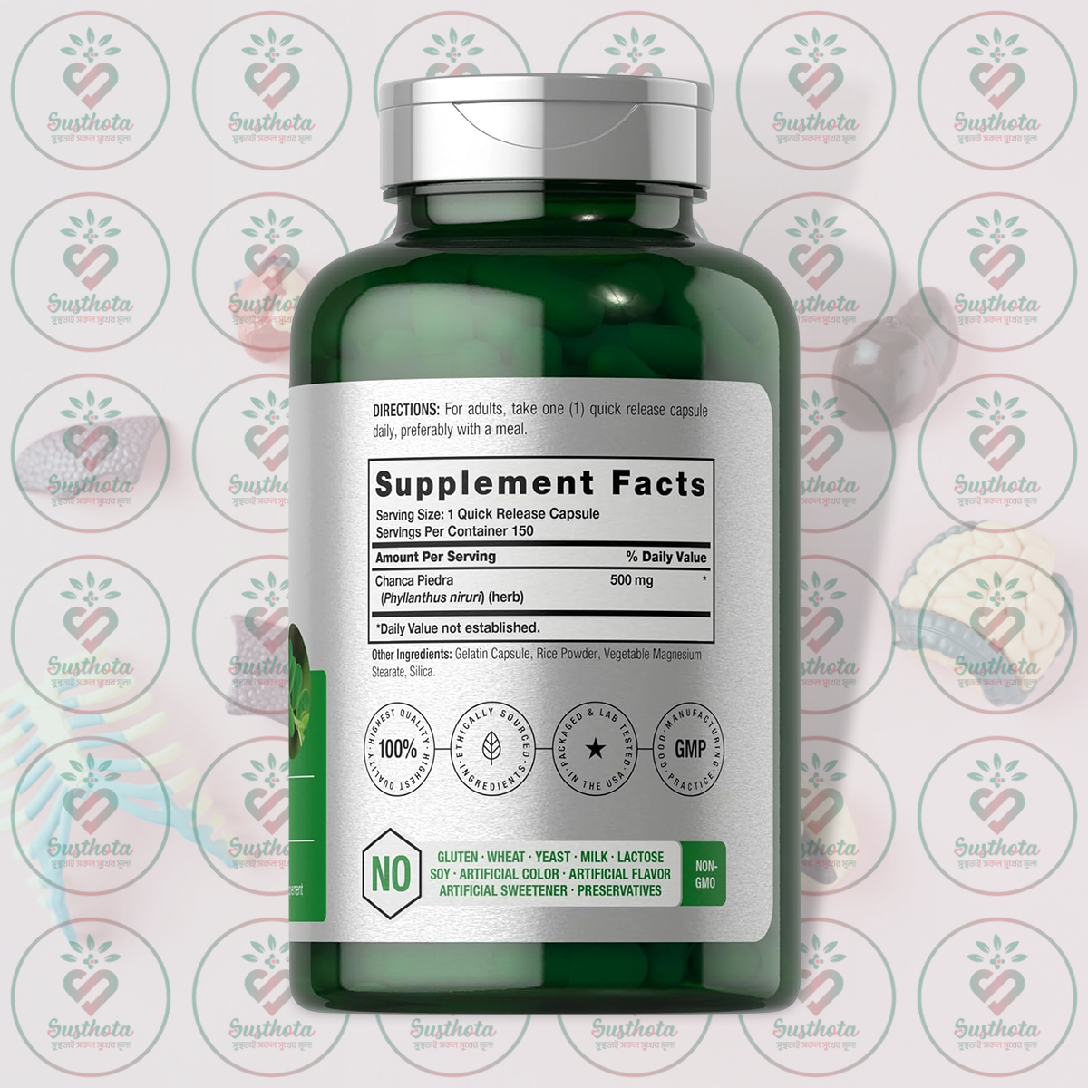 - Provides 500 mg of pure Chanca Piedra per capsule daily.