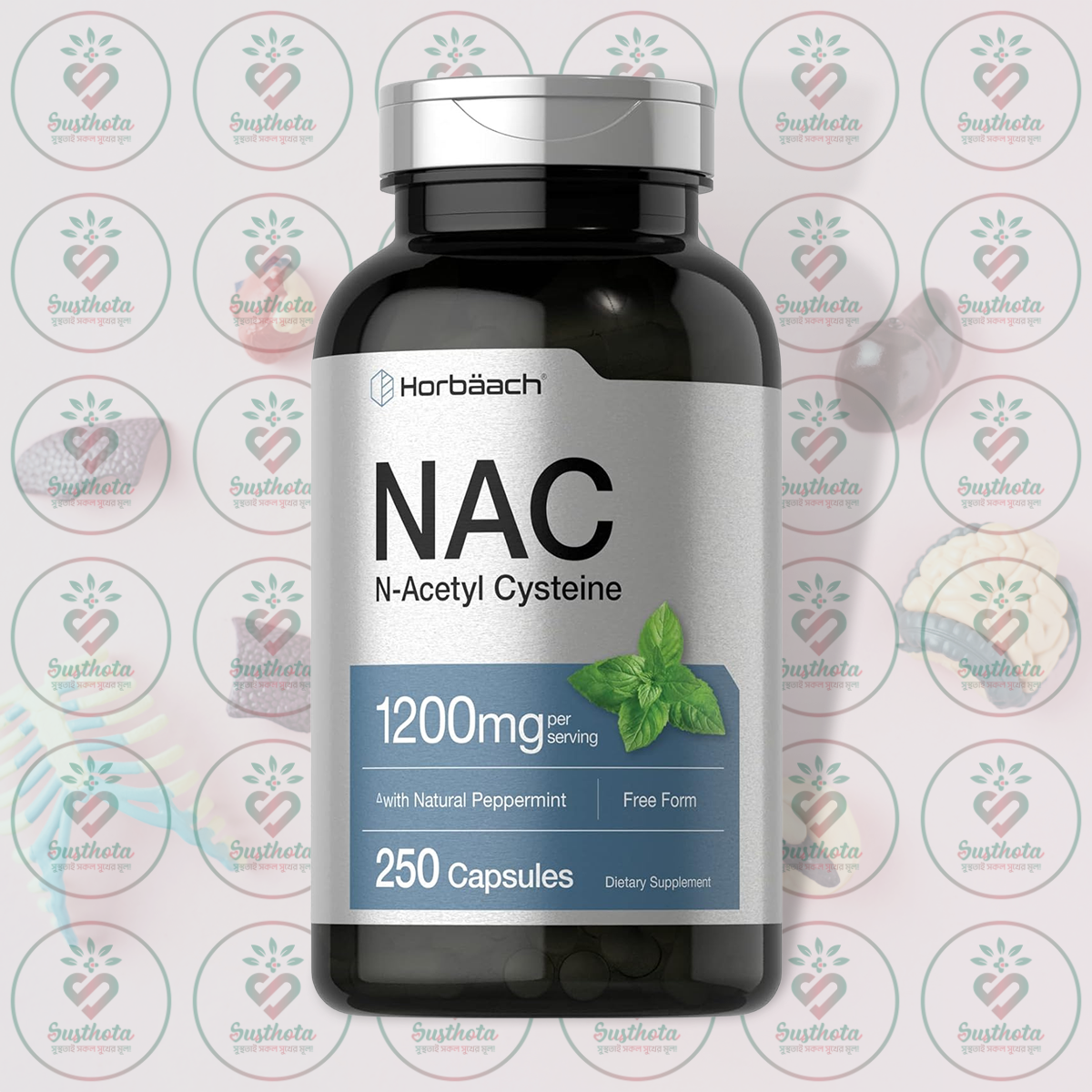 Horbäach NAC N-Acetyl Cysteine - 1200mg - 250 Capsules is now available in Bangladesh at Susthota. This powerful amino acid supplement is formulated to support respiratory health, boost antioxidant protection, and enhance overall cellular wellness. It contains 1200mg of pure N-Acetyl Cysteine per serving with natural peppermint flavor for improved palatability. With 250 quick-release capsules providing 125 servings, it offers exceptional value and convenience for daily supplementation. Horbäach NAC is now available at the lowest price in our shop, ensuring accessibility for health-conscious individuals seeking premium antioxidant support. Order authentic NAC supplement from our shop today at the cheapest price in BD. Call our helpline to know the latest price and availability of the original Horbäach NAC in Bangladesh. Experience the powerful benefits of this essential amino acid for respiratory and cellular health, now available in BD.