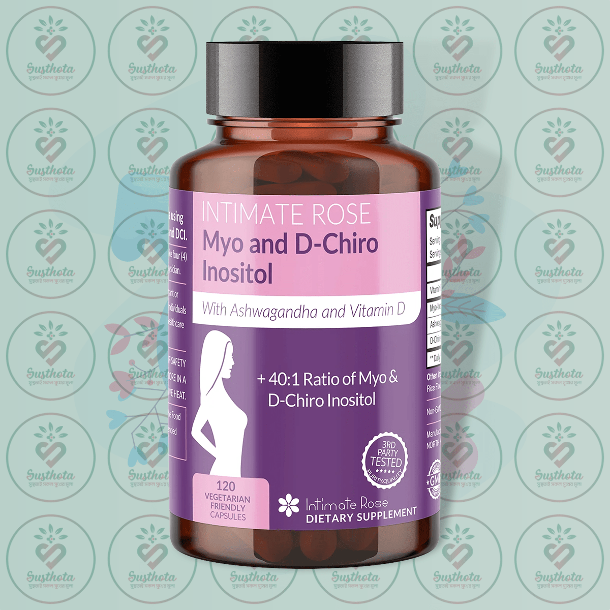 INTIMATE ROSE Myo and D-Chiro Inositol with Ashwagandha and Vitamin D - 120 Vegetarian Capsules is now available in Bangladesh at Susthota. This scientifically formulated supplement provides optimal 40:1 inositol ratio for hormonal balance and PCOS support. It contains premium ingredients including adaptogenic Ashwagandha and essential Vitamin D3 for comprehensive women's health. With 120 vegetarian capsules providing 30 servings, it offers exceptional value for long-term hormonal wellness support. INTIMATE ROSE Myo and D-Chiro Inositol is now available at the lowest price in our shop, ensuring accessibility for women seeking natural hormonal balance. Order authentic INTIMATE ROSE supplement from our shop today at the cheapest price in BD. Call our helpline to know the latest price and availability of the original INTIMATE ROSE Myo and D-Chiro Inositol in Bangladesh. Experience the power of scientifically-backed women's health support, now available in BD.