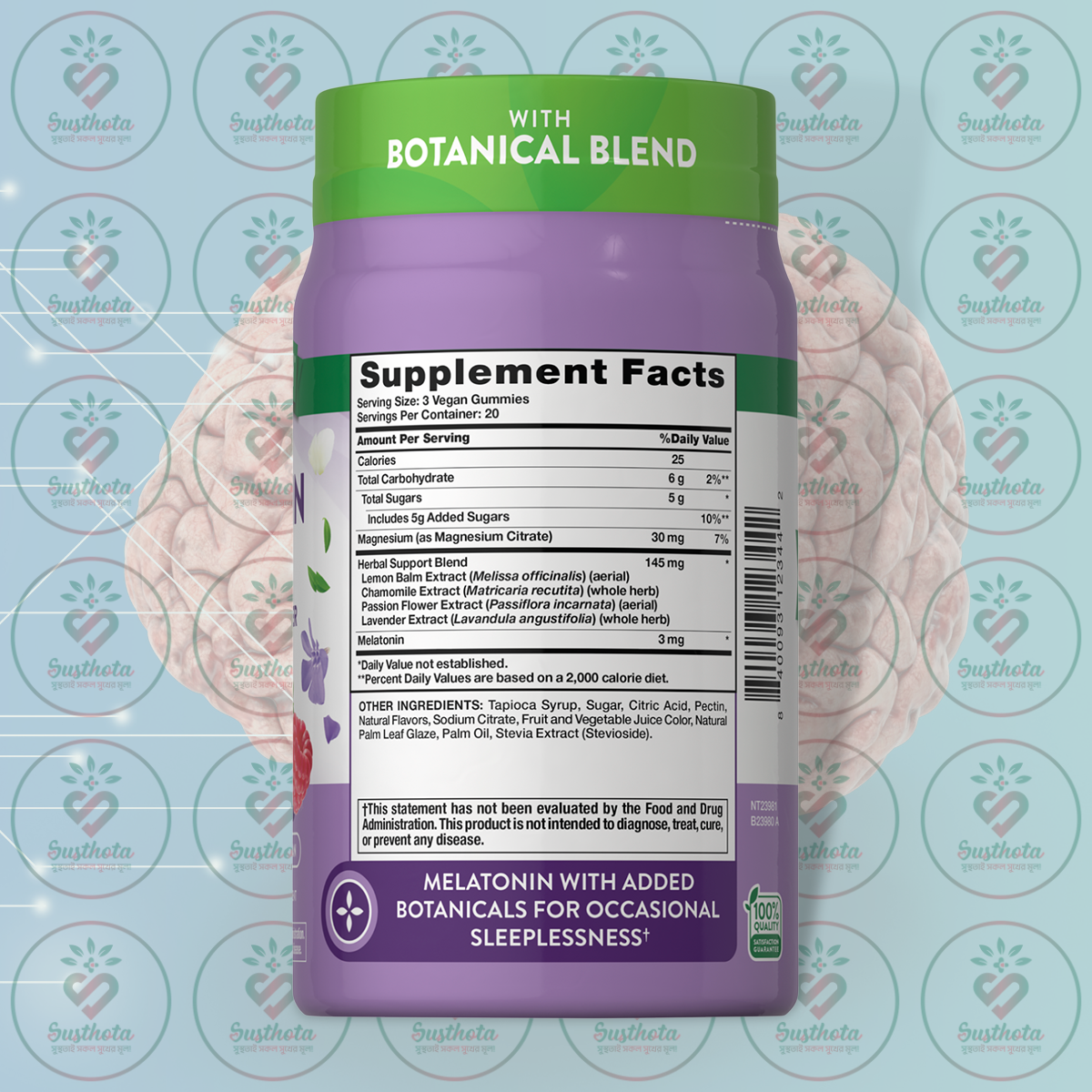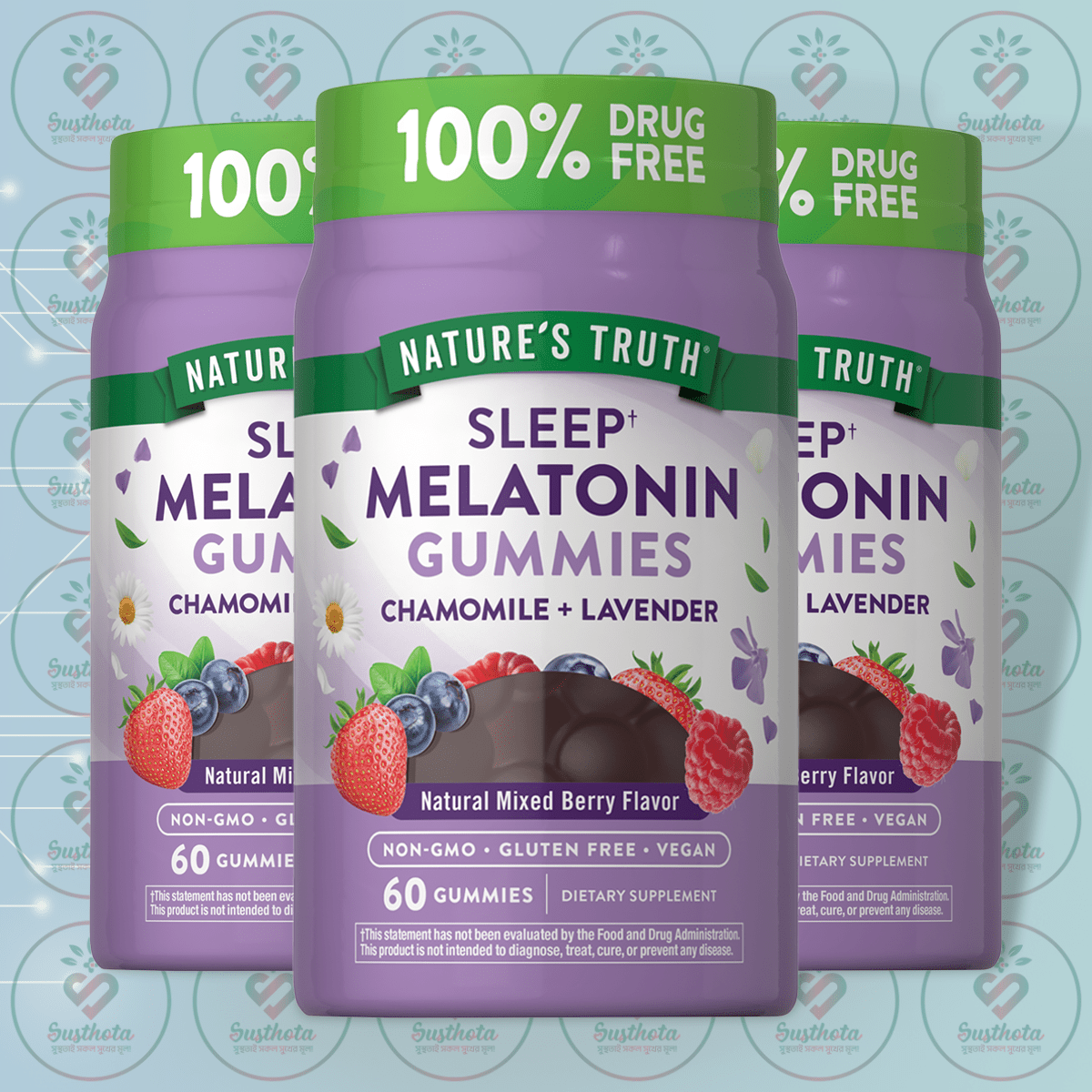 Nature's Truth Sleep Melatonin Gummies with Chamomile + Lavender - 3mg - 60 Vegan Gummies is now available in Bangladesh at Susthota. This premium 100% drug-free sleep supplement is formulated to promote natural sleep with melatonin and soothing botanical extracts. It contains chamomile, lavender, lemon balm, and passion flower for comprehensive sleep support. With 60 vegan gummies providing 20 servings, it offers excellent value for consistent sleep improvement. Nature's Truth Sleep Melatonin Gummies is now available at the lowest price in our shop, ensuring accessibility for better sleep health. Order authentic Sleep Melatonin Gummies from our shop today at the cheapest price in BD. Call our helpline to know the latest price and availability of the original Nature's Truth Sleep Melatonin Gummies in Bangladesh. Experience natural, restful sleep with botanical support, now available in BD.