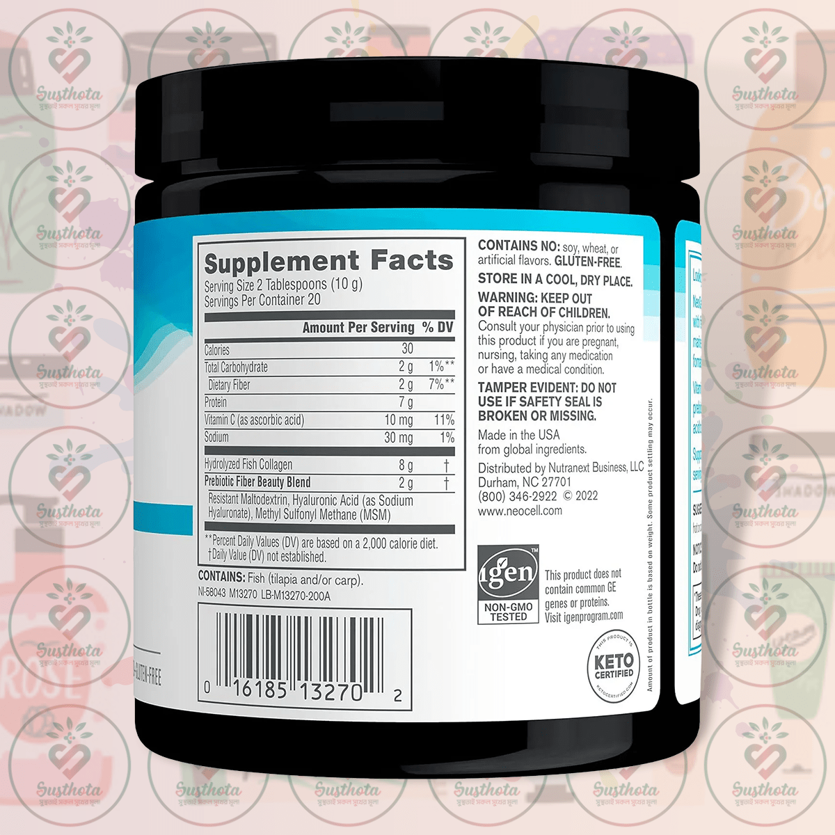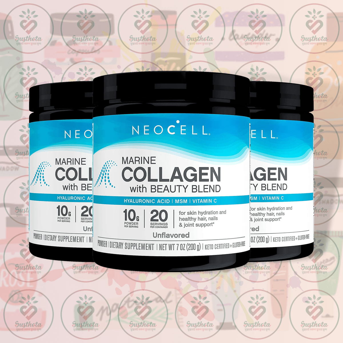 NeoCell Marine Collagen with Beauty Blend - 10g - 200g Powder is now available in Bangladesh at Susthota. This premium marine collagen supplement is formulated with hydrolyzed fish collagen, hyaluronic acid, MSM, and Vitamin C for comprehensive beauty support. It provides 8 grams of highly bioavailable marine collagen per serving for optimal skin hydration and joint health. With 20 servings per container, this keto-certified and gluten-free powder offers exceptional value and convenience. NeoCell Marine Collagen is now available at the lowest price in our shop, ensuring accessibility for beauty-conscious individuals. Order authentic Marine Collagen from our shop today at the cheapest price in BD. Call our helpline to know the latest price and availability of the original NeoCell Marine Collagen in Bangladesh. Experience the transformative power of marine collagen for radiant skin and healthy joints, now available in BD.