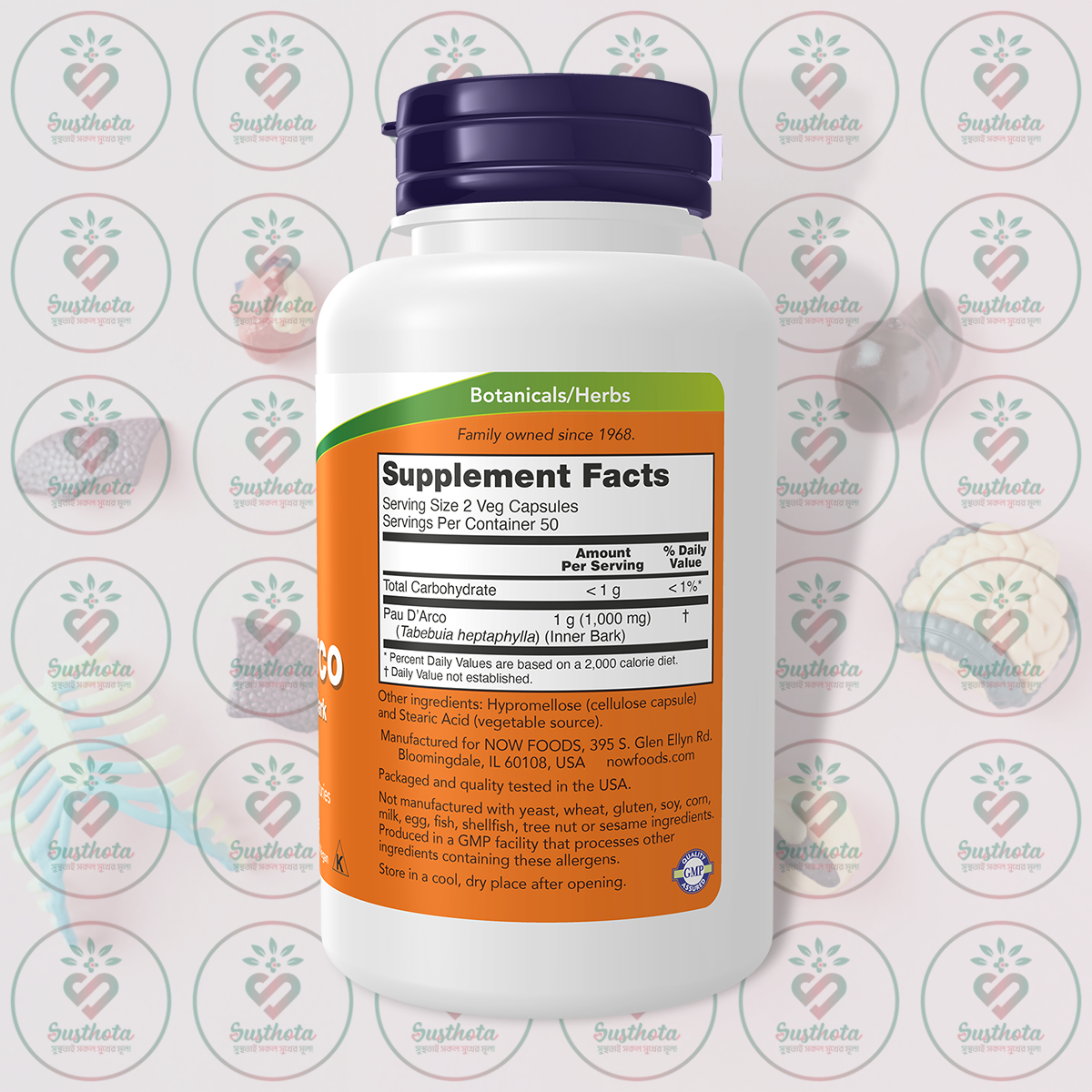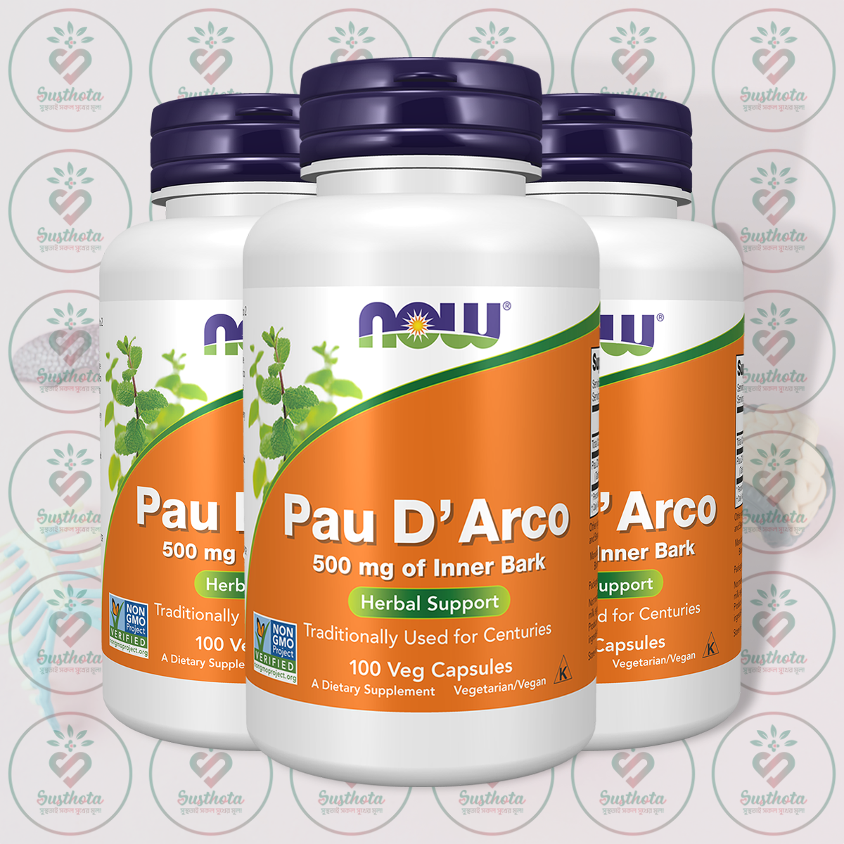 NOW Pau D'Arco - 500 mg - 100 Veg Capsules is now available in Bangladesh at Susthota. This traditional herbal supplement is formulated from pure inner bark extract to support immune function and overall wellness. It contains beneficial compounds lapachol and beta-lapachone for natural health support. With 100 vegetarian capsules providing 50 servings, it offers excellent value for daily supplementation. NOW Pau D'Arco is now available at the lowest price in our shop, ensuring accessibility for health-conscious individuals. Order authentic Pau D'Arco from our shop today at the cheapest price in BD. Call our helpline to know the latest price and availability of the original NOW Pau D'Arco in Bangladesh. Experience the ancient healing power of South America's treasured herb, now available in BD.