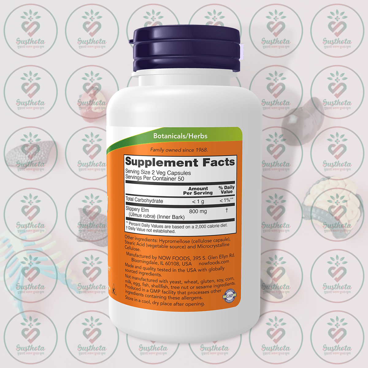 NOW Slippery Elm - 400 mg - 100 Veg Capsules is now available in Bangladesh at Susthota. This traditional herbal supplement is formulated to coat and soothe the GI tract, providing natural digestive comfort and support. It contains pure Slippery Elm inner bark with beneficial mucilage for gentle gastrointestinal relief. With 100 vegetarian capsules providing 50 servings, it offers excellent value for daily digestive wellness support. NOW Slippery Elm is now available at the lowest price in our shop, ensuring accessibility for those seeking natural digestive solutions. Order authentic Slippery Elm from our shop today at the cheapest price in BD. Call our helpline to know the latest price and availability of the original NOW Slippery Elm in Bangladesh. Experience the time-tested benefits of this gentle herbal remedy, now available in BD.