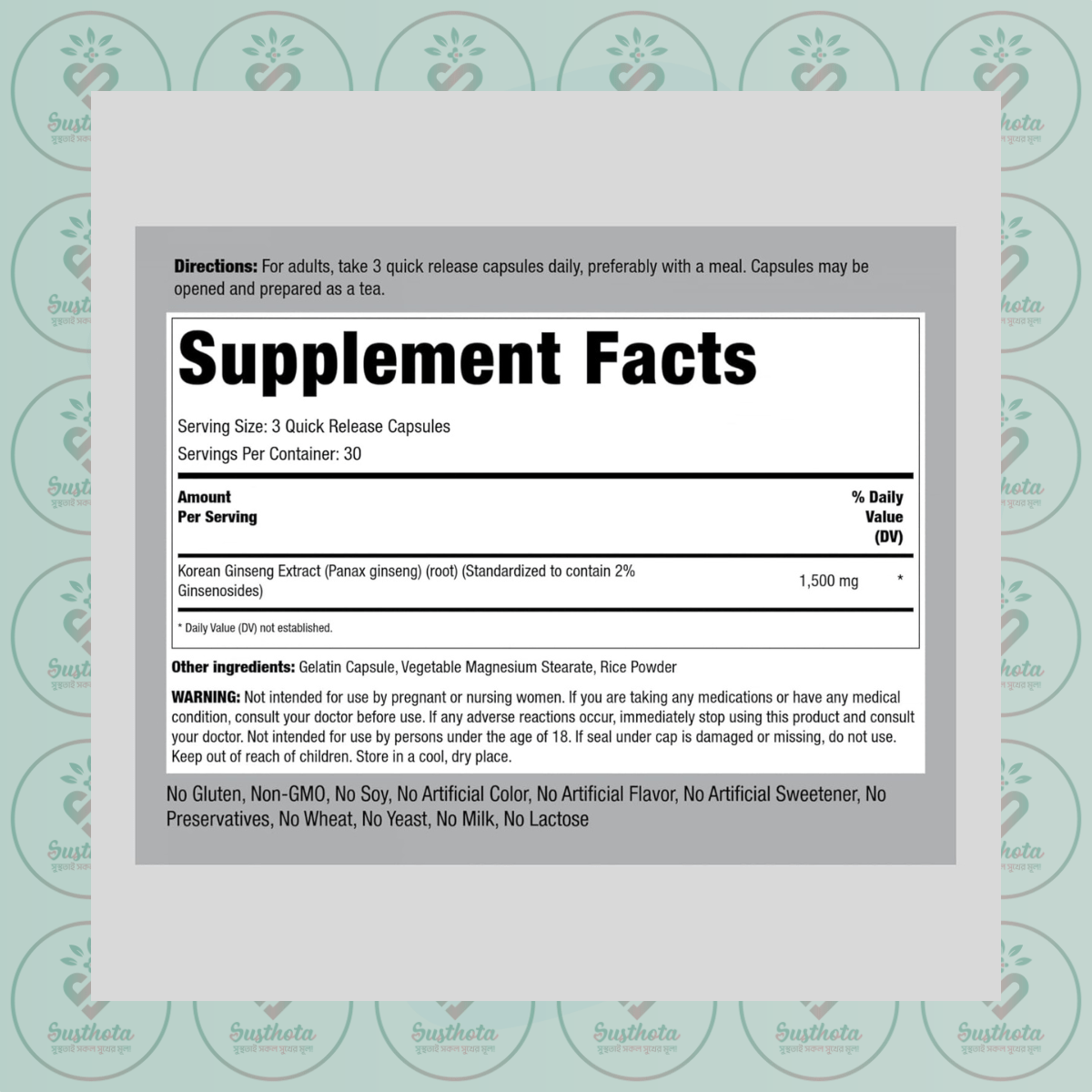 Ingredients | Korean Ginseng Extract (Panax ginseng) (root) (Standardized to contain 2% Ginsenosides), Gelatin Capsule, Vegetable Magnesium Stearate, Rice Powder |
