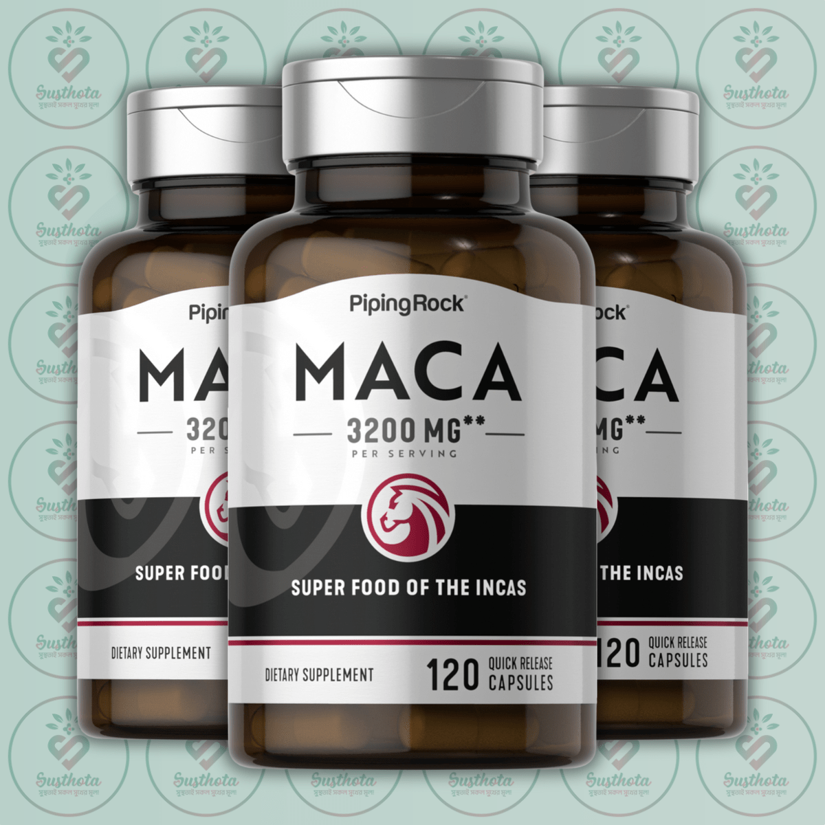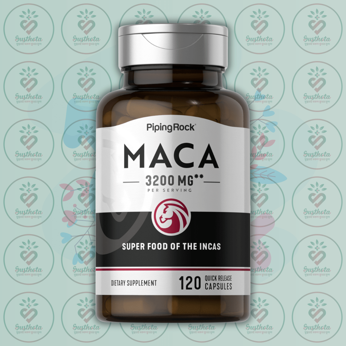 Piping Rock Maca Root Capsules are now available in Bangladesh at Susthota. This superfood supplement offers 3200 mg of Red, Yellow, and Black Maca to support energy, fertility, vitality, and overall sexual wellness for both men and women. Shop original Piping Rock Maca Root Capsules at the cheapest price in Bangladesh, combining trusted quality with affordability. These non-GMO, gluten-free capsules are laboratory-tested for purity and safety. Call our helpline to know the latest price and availability of Piping Rock Maca Root Capsules in BD.