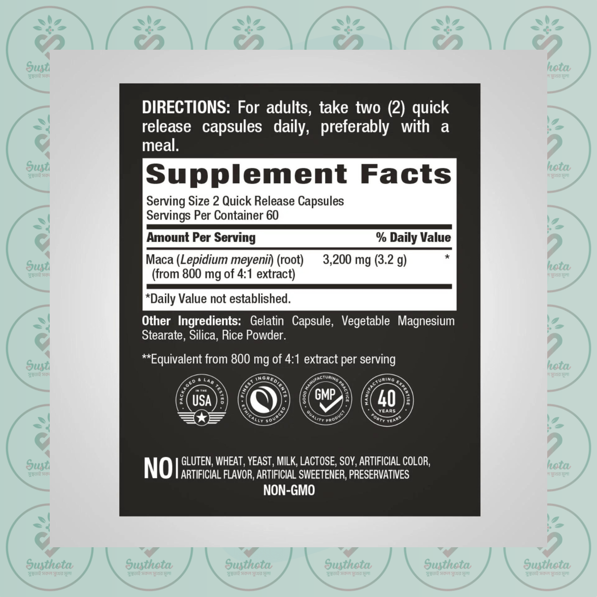 | Ingredients | Maca Root (Lepidium meyenii) (root) 4800 mg equivalent from 1200 mg 4:1 extract, Gelatin Capsule, Vegetable Magnesium Stearate, Silica, Rice Powder |