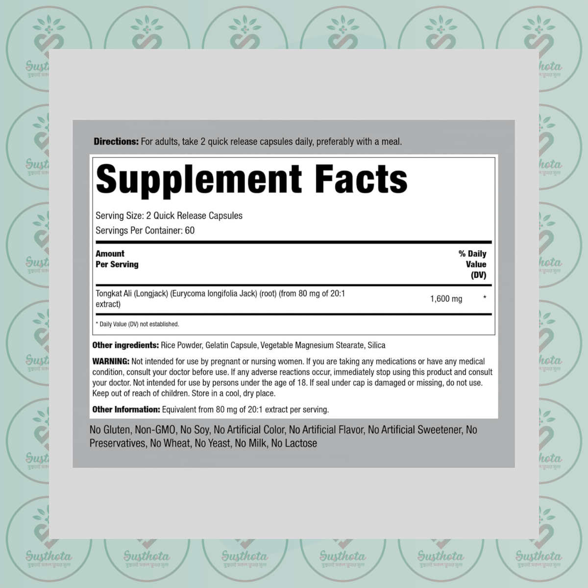 Ingredients | Tongkat Ali (Longjack) Extract (Eurycoma longifolia Jack) 1600 mg (from 80 mg of 20:1 extract), Rice Powder, Gelatin Capsule, Vegetable Magnesium Stearate, Silica |