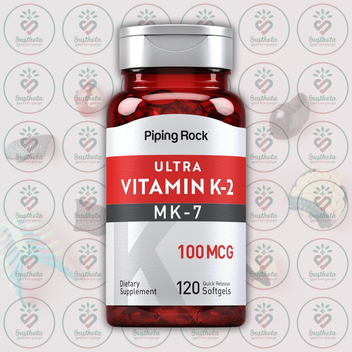 Piping Rock Ultra Vitamin K-2 with MK-7 - 100mcg - 120 Quick Release Softgels is now available in Bangladesh at Susthota. This premium supplement delivers 100 mcg of Vitamin K2 per softgel, promoting bone strength and cardiovascular health with superior bioavailability. Piping Rock Ultra Vitamin K-2 is now available at the lowest price in BD, offering a natural and effective way to support calcium metabolism. Get authentic Piping Rock Ultra Vitamin K-2 from our shop at the cheapest price in Bangladesh. Call our helpline to know the latest price and availability of Piping Rock Ultra Vitamin K-2 in Bangladesh.