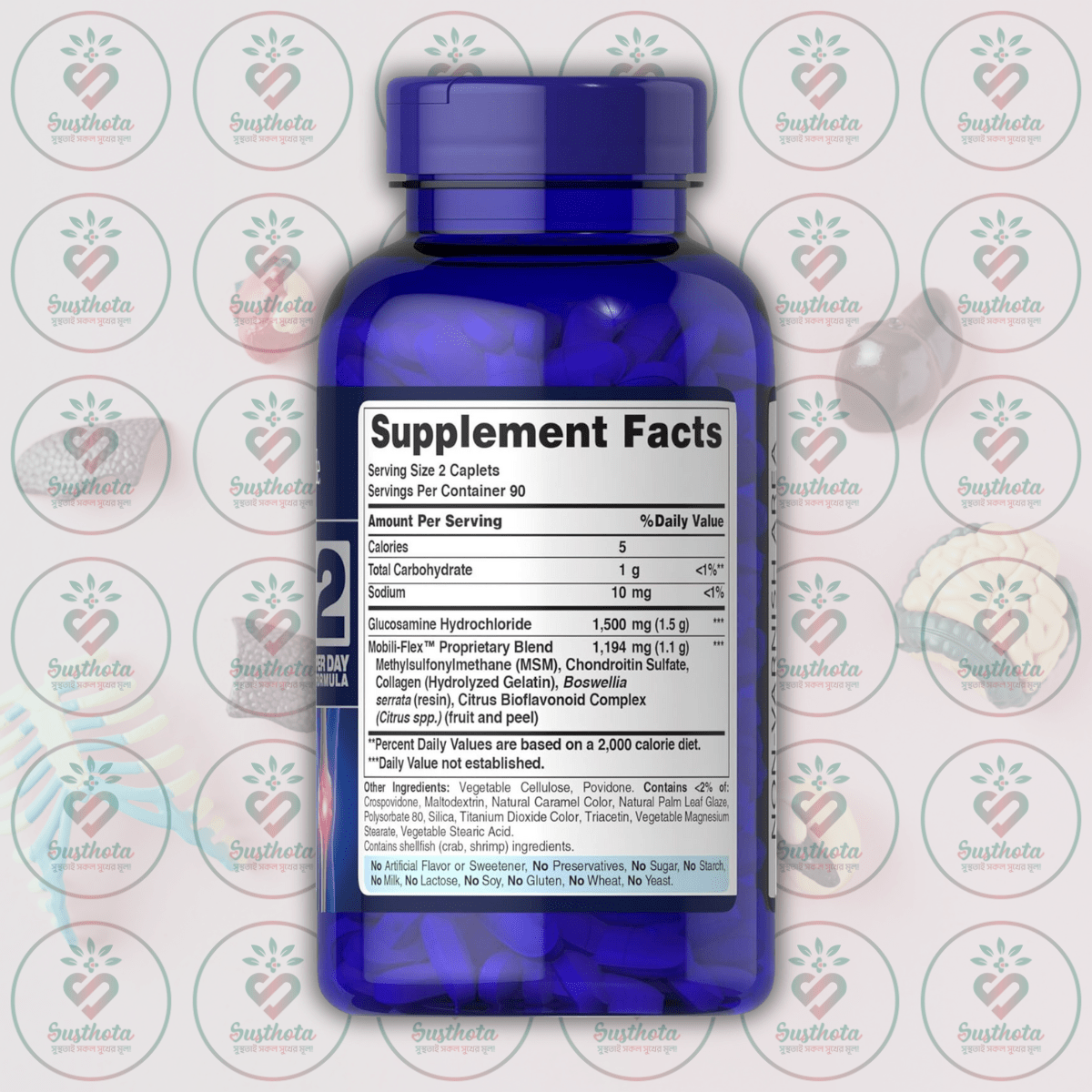 Puritan's Pride Glucosamine Chondroitin MSM - 2 Per Day Formula - 180 Coated Caplets is now available in Bangladesh at Susthota. This joint health supplement combines Glucosamine Hydrochloride, Chondroitin Sulfate, MSM, and Boswellia serrata for effective joint support. It promotes mobility, flexibility, and comfort, making it ideal for those experiencing joint stiffness or discomfort. Puritan's Pride Glucosamine Chondroitin MSM is now available at the lowest price in our shop, ensuring affordability without compromising quality. Order authentic Glucosamine Chondroitin MSM from our shop today at the cheapest price in BD. Call our helpline to know the latest price and availability of this product in Bangladesh.