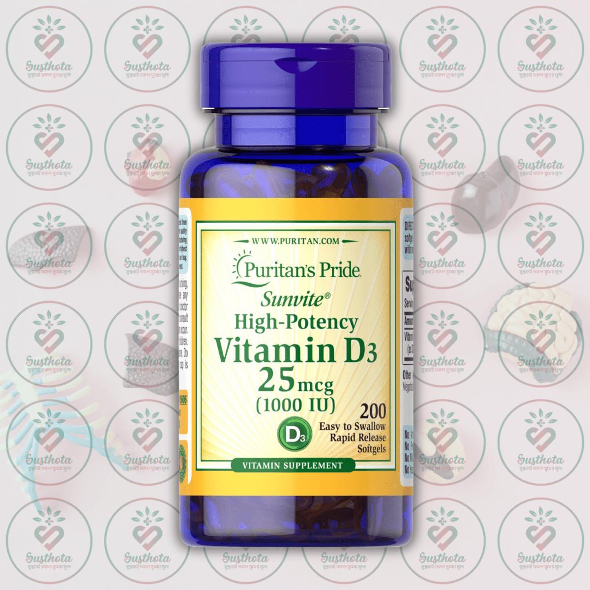 Puritan's Pride High-Potency Vitamin D3 – 25 mcg (1000 IU) – 200 Softgels is now available in Bangladesh at Susthota. This high-quality supplement is formulated to support bone health, immune function, and overall well-being. Each softgel delivers 1000 IU of Vitamin D3, ensuring optimal calcium absorption and immune support. With 200 rapid-release softgels per bottle, it offers excellent value for maintaining daily health. Puritan's Pride High-Potency Vitamin D3 is now available at the lowest price in BD, making it accessible to everyone. Order authentic Vitamin D3 from our shop today at the cheapest price in Bangladesh. Call our helpline to know the latest price and availability of Puritan's Pride High-Potency Vitamin D3 in Bangladesh. Enhance your health and wellness with this trusted supplement, now available in BD.