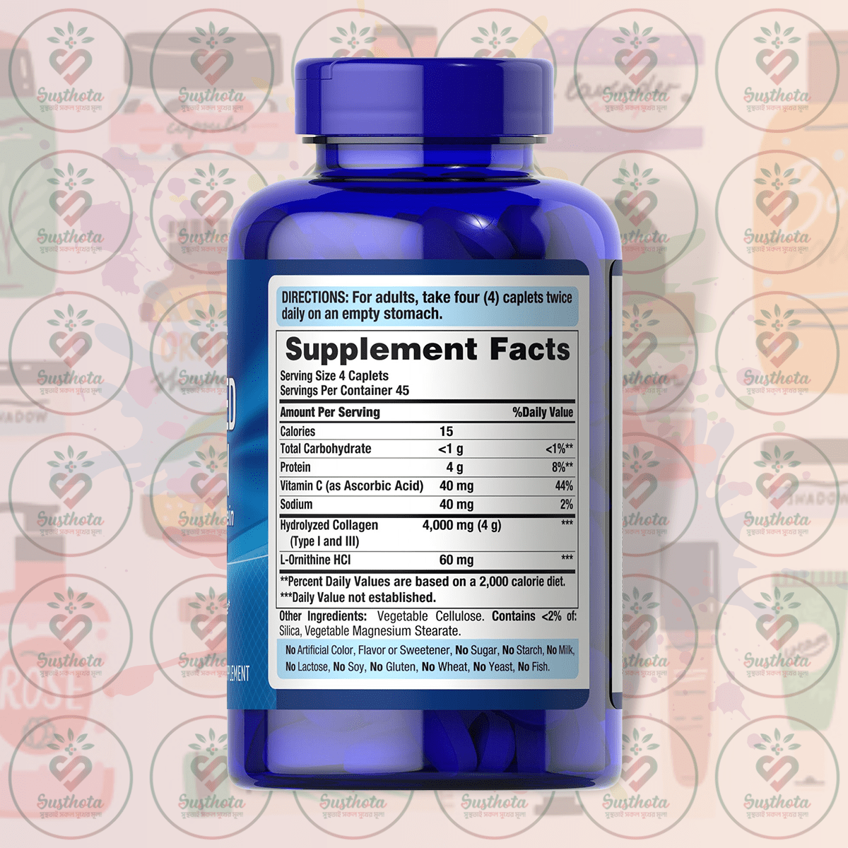 | Ingredients | Hydrolyzed Collagen (Type I and III) 4,000 mg (4 g), Vitamin C (as Ascorbic Acid) 40 mg, Sodium 40 mg, L-Ornithine HCl 60 mg, Other Ingredients: Vegetable Cellulose. Contains <2% of: Silica, Vegetable Magnesium Stearate. |