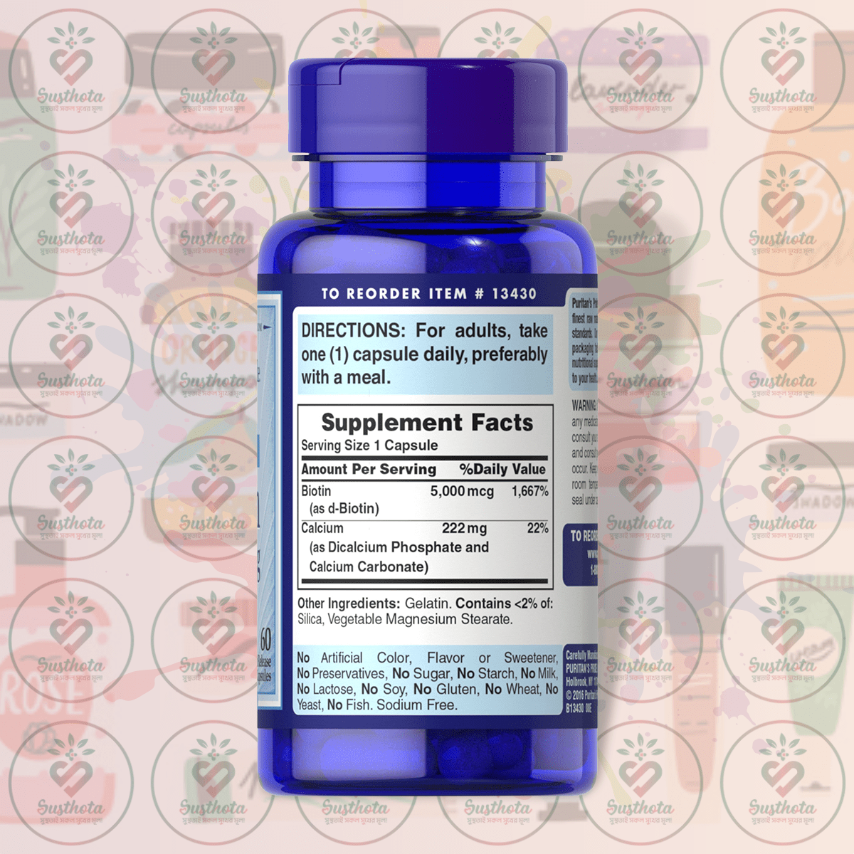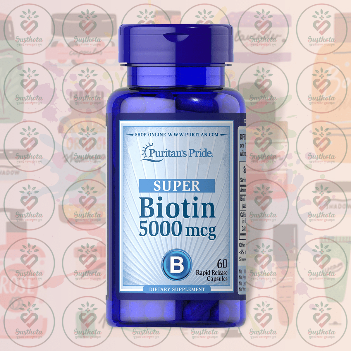 Puritan's Pride Super Biotin - 5000 mcg - 60 Rapid Release Capsules is now available in Bangladesh at Susthota. This premium high-potency B vitamin supplement is formulated to support beautiful hair, radiant skin, and strong nails while boosting energy metabolism. It contains pure d-Biotin at 5000 mcg per capsule for maximum effectiveness. With 60 rapid release capsules providing excellent value, it offers a convenient way to achieve your beauty and wellness goals. Buy authentic Puritan's Pride Super Biotin from our shop today at the lowest price in BD. Get original Puritan's Pride Super Biotin now available at cheap price in Bangladesh. Call our helpline to know the latest price and availability of the Puritan's Pride Super Biotin in Bangladesh. Experience the transformative power of biotin for gorgeous hair, glowing skin, and stronger nails, now available in BD.